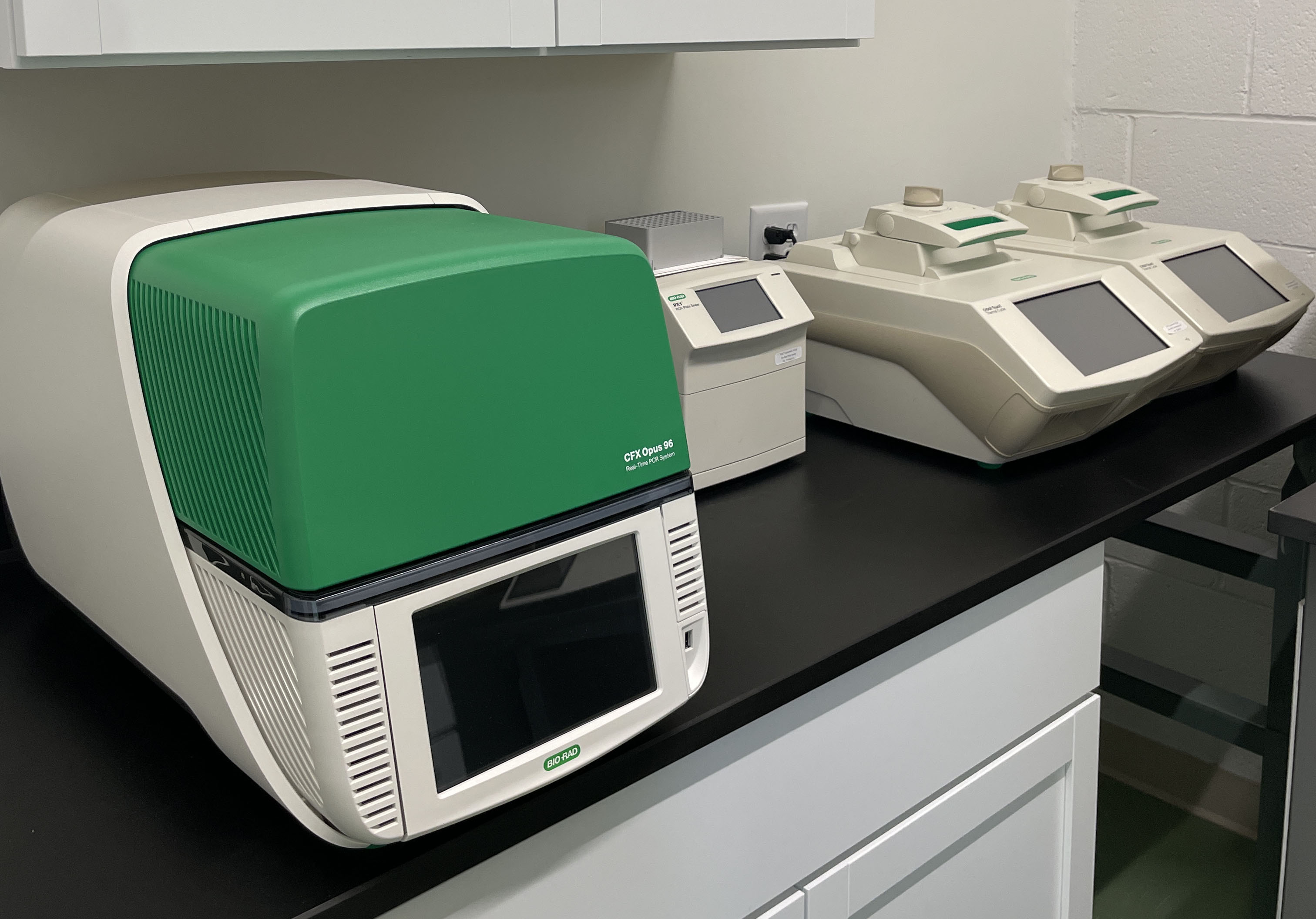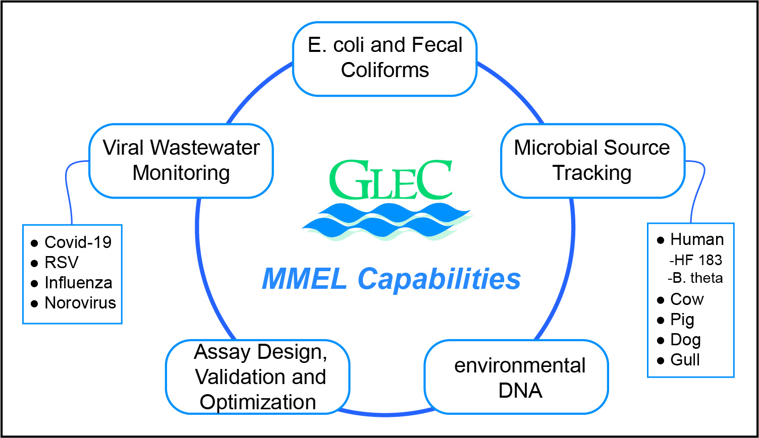 The GLEC Microbiology and Molecular Ecology Laboratory was established in 2021 to provide viral wastewater monitoring for public health partners. It was built as a Biosafety Laboratory Level 2 (BSL2) to support this initial work and allows us to process raw wastewater samples. We have since expanded our capabilities to include environmental DNA and Microbial Source Tracking (MST) on surface water samples to determine the source of fecal contamination for a variety of animal and human targets. and environmental DNA. Our staff has performed organic extractions and column kit extractions for a variety of applications with RNA and DNA. GLEC researchers can are experienced in executing gene expression experiments and can help develop, validate, and optimize assays to serve client needs. With GLEC’s extensive field sampling experience and equipment, GLEC researchers can also provide proper sample collection, preservation, and storage for a wide range of experimental designs and integrated services.